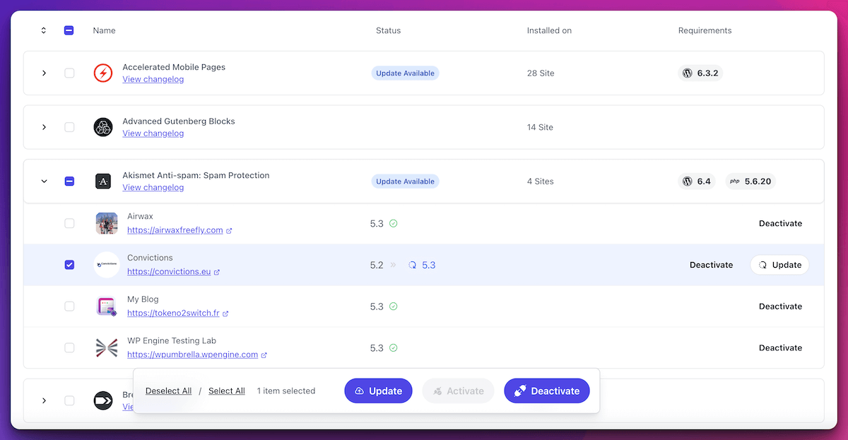 One-click bulk updates and installs for plugins, themes, and WordPress core
